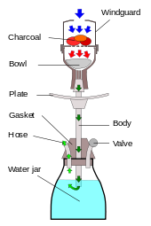 -Thân shisha nằm trên một bình nước. Đầu dưới của ống thân nằm dưới mặt nước. Khói được truyền qua thân và khỏi đầu dưới, tạo thành bọt trong nước. Làm như vậy sẽ làm mát và làm ẩm khói. Người ta thường dùng nước trái cây đổ thêm vào nước hoặc thay hoàn toàn nước. Một miếng trái cây, lá bạc hà, và đá viên cũng có thể bỏ thêm vào.